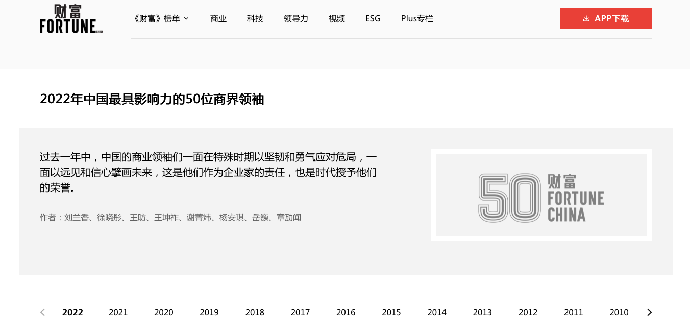 截圖來自《財富》官網 據了解,《財富》于2005年開始評選“中國最具影響力的商界領袖”。 點擊“閱讀原文”,了解更多。 | 責 編:高紅梅 | 校 對:周 芒 | 審 核:項 麗/甘豐錄