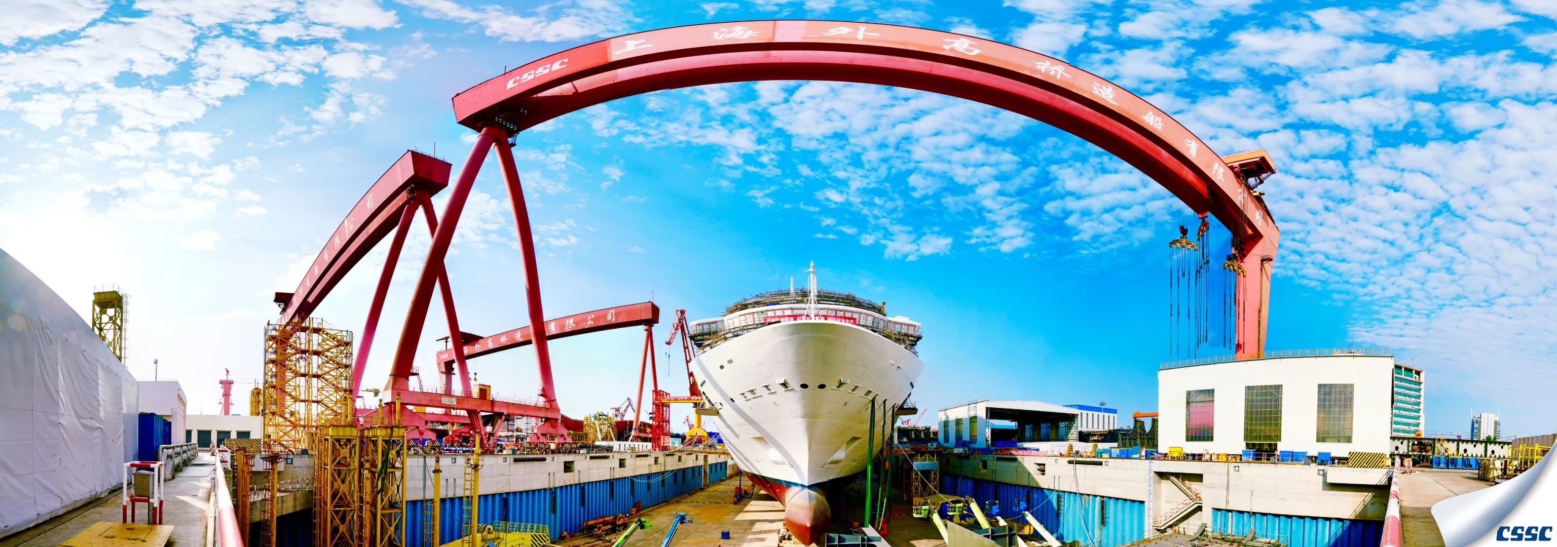 艷陽下的外高橋造船基地,半遮面紗的中國首制大型郵輪矗立其中,天地之間都似是她的舞臺,讓我們翹首以待她真正的芳容吧。