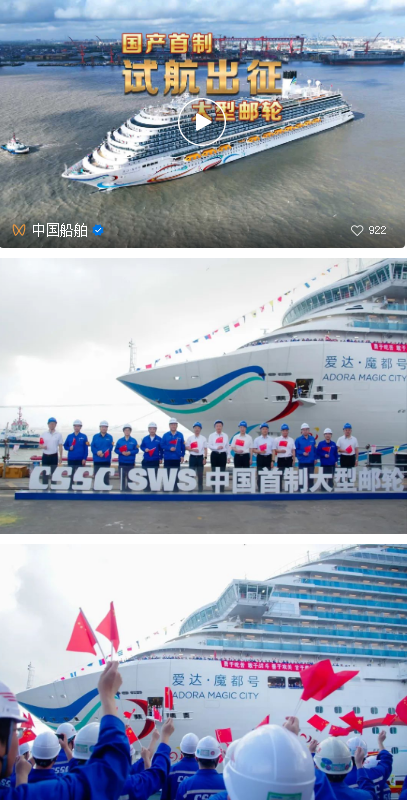 “我宣布,中國首制大型郵輪試航出征!”