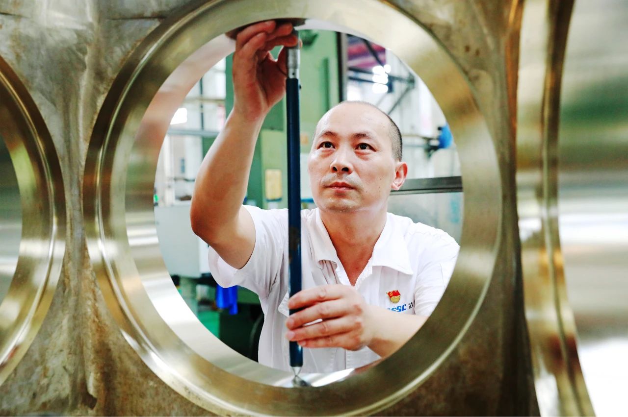 在武漢船機平臺生產(chǎn)現(xiàn)場,一名機床操作師傅,正在對加工后的零件進行檢測,專注的表情展現(xiàn)了船舶人嚴把質(zhì)量關(guān),人品以誠心為本,企品以恒心為要,產(chǎn)品以匠心為重的精神風(fēng)貌。