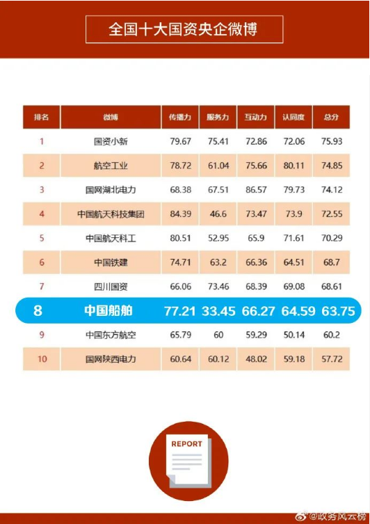 1月31日,由微博出品,人民網輿情數據中心、人民網數據研究院提供學術支持的“2023年度政務微博影響力報告”發布。“中國船舶”微博登上“全國十大國資央企微博”榜單,這是“中國船舶”微博第三次進入“全國十大國資央企微博”排行榜。