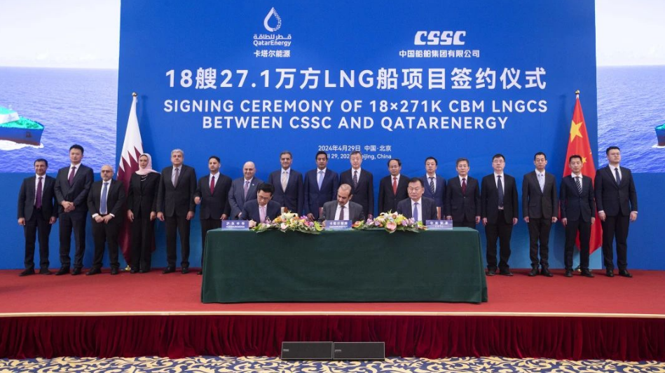 4月29日,中國船舶集團(tuán)有限公司與卡塔爾能源在京舉行18艘全球最大27.1萬立方米超大型液化天然氣(LNG)運(yùn)輸船項(xiàng)目簽約儀式。工業(yè)和信息化部副部長單忠德,外交部西亞北非司大使呂健,中國船舶集團(tuán)董事長溫剛、副總經(jīng)理盛紀(jì)綱,卡塔爾能源事務(wù)國務(wù)大臣、卡塔爾能源總裁兼首席執(zhí)行官薩阿德·謝里達(dá)·阿爾卡比,卡塔爾能源天然氣首席執(zhí)行官卡利德·阿爾-塞尼,卡塔爾能源商務(wù)和業(yè)務(wù)發(fā)展執(zhí)行副總裁賈西姆·阿爾馬拉祖齊等領(lǐng)導(dǎo)和嘉賓出席簽約儀式。