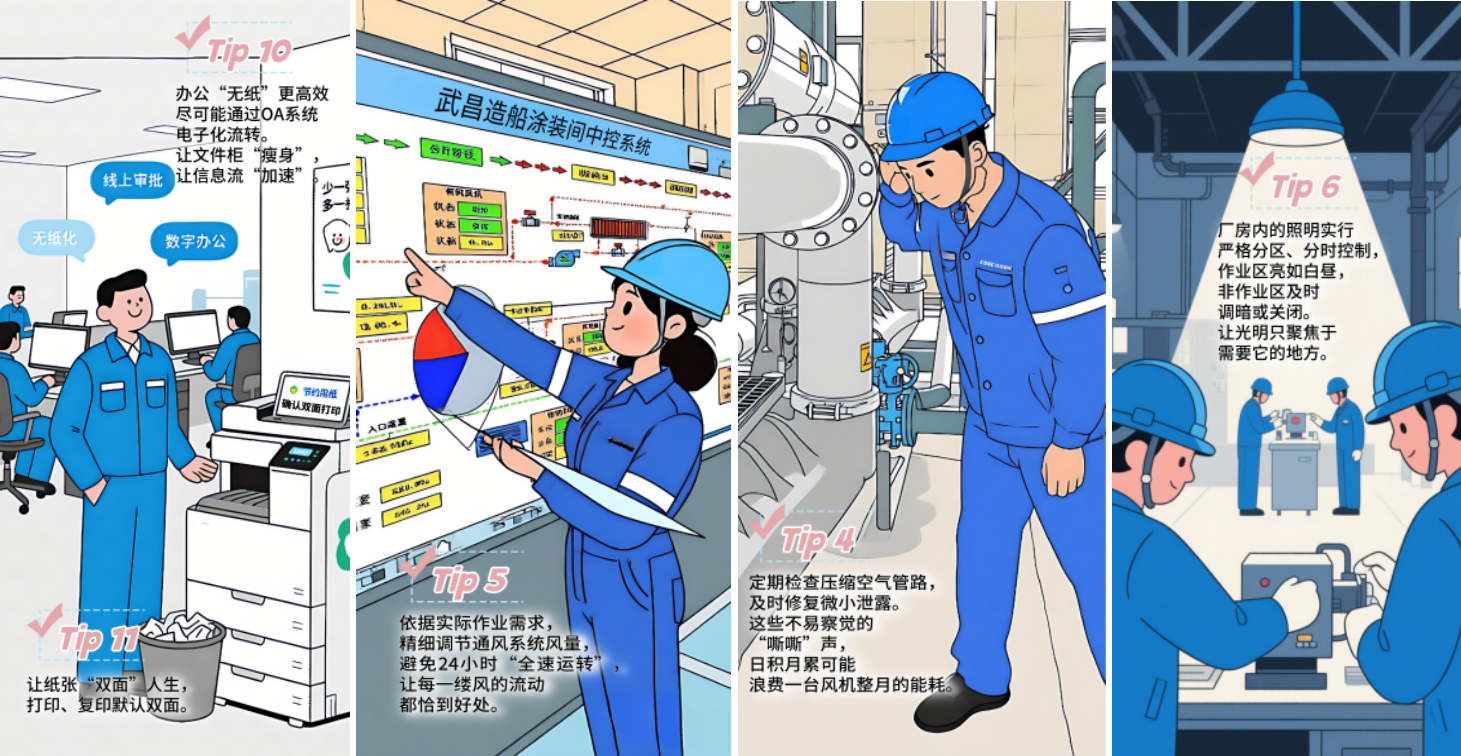 武昌造船在節能宣傳周期間組織開展了“船廠節能秘籍”征集活動,以船廠員工的一天為軸線,收集到各類節能基本操作,形成了《這些基本操作,我知道你一定能做到》宣傳材料,并通過公司公眾號發布,向員工普及節能知識與技巧,擴大節能宣傳覆蓋面。同時開展 “停用空調”能源緊缺體驗行動,倡議全體員工在全國低碳日,關閉辦公室、會議室及非必要區域空調設備,通過實際行動感受能源緊缺,踐行節能理念,進一步增強員工資源憂患意識。