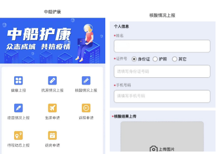 物資公司與樂(lè)普(北京)醫(yī)療器械股份有限公司合作開(kāi)發(fā)的“中船護(hù)康”健康監(jiān)測(cè)上報(bào)系統(tǒng),具備員工健康上報(bào)、抗原檢測(cè)、核酸情況、疫苗接種、行程動(dòng)態(tài)5種上報(bào)模塊,以及出差、返程、返崗3類申請(qǐng),共8大功能,在數(shù)字化防疫方面做出了新的嘗試。