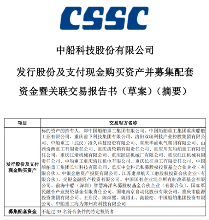 10月10日,中國船舶集團有限公司旗下上市公司中船科技股份有限公司發(fā)布《發(fā)行股份及支付現(xiàn)金購買資產(chǎn)并募集配套資金暨關(guān)聯(lián)交易報告書(草案)》等公告。根據(jù)公告,中船科技擬通過發(fā)行股份及支付現(xiàn)金的方式購買交易對方持有的交易作價合計約為91.98億元的標的資產(chǎn),并擬非公開發(fā)行股票募集不超過30億元的配套資金。該草案的公布標志著中船科技重大資產(chǎn)重組取得具有里程碑意義的重要進展。