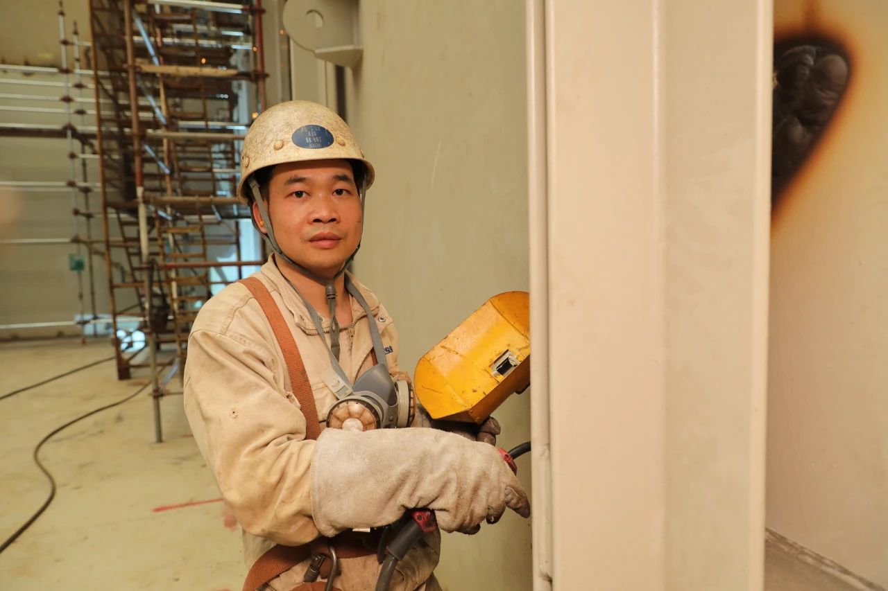 為了更好地掌握超厚板的焊接,搭載一部支持大合攏一班的梁金華和同事們一起進行了專門的焊接培訓。有趣的是,老師謝祖靠、學生梁金華,都是來自該所技校的畢業生。既是師兄弟、又是師徒,這在黃埔文沖的工人隊伍當中并不少見。