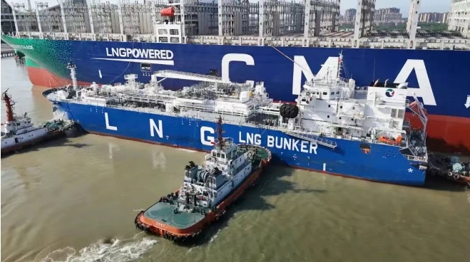 6月20日,全球首款江海直達(dá)型LNG加注船“淮河能源啟航”號在上海長興島順利完成對全球首艘23000TEU雙燃料超大型集裝箱船“達(dá)飛 雅克·薩德”號的LNG燃料補(bǔ)給作業(yè)。這兩艘不同領(lǐng)域的“冠軍”船舶均由中船集團(tuán)旗下滬東中華建造,兩船首次“牽手”,為航運(yùn)業(yè)綠色低碳發(fā)展留下佳話。