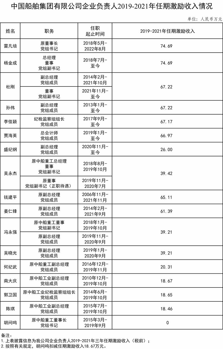 中國船舶集團有限公司企業負責人2019-2021年任期激勵收入情況