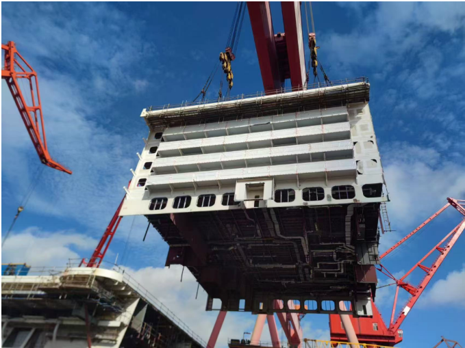 此次完成搭載的U2總段以乘客住艙區域為主,跨度為五層甲板,是郵輪搭載的首個帶陽臺的總段,其順利搭載是總段完整性建造速度提升和船塢快速搭載的集中體現。