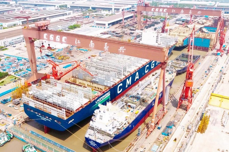 ????眾所周知,船塢是船舶總組搭載的場所,是造船生產(chǎn)的核心資源。江南造船3號船塢長580米、寬120米,是目前國內(nèi)在用的最大船塢。為提升船塢利用效率,江南造船采取“雙線并造”模式,即一批次液化氣船和一批次超大型集裝箱船同時(shí)建造。此次雙船出塢是江南造船“雙線并造”模式的第五個(gè)批次,也是今年3號塢出塢的第二個(gè)批次。