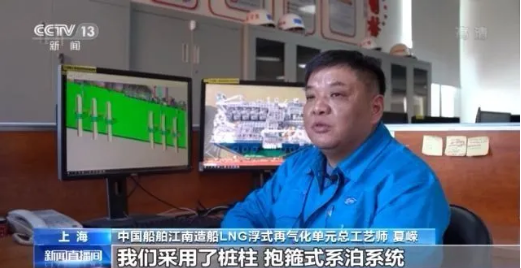 中國船舶集團旗下江南造船LNG浮式再氣化單元總工藝師 夏嶸:與常規船舶采用纜繩系泊不同,我們采用了樁柱—抱箍式系泊系統。該套系統能夠滿足FRU在部署地營運期間永久性碼頭系泊的需要。