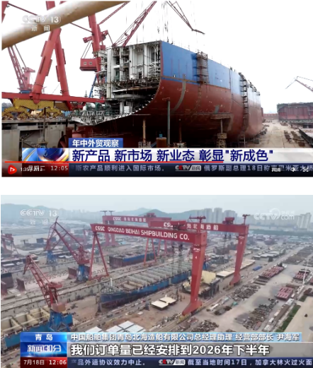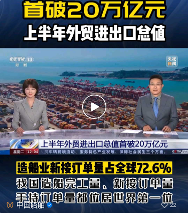 7月18日,央視《新聞30分》年中外貿(mào)觀察鏡頭再次對(duì)準(zhǔn)火熱的造船市場(chǎng),在出口面臨較大外需壓力的背景下,上半年,中國外貿(mào)頂住了壓力、穩(wěn)住了規(guī)模、提升了質(zhì)量,既呈現(xiàn)出“韌性”底色,又展現(xiàn)了多種“新”的成色。