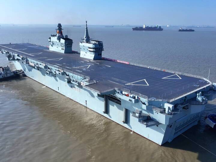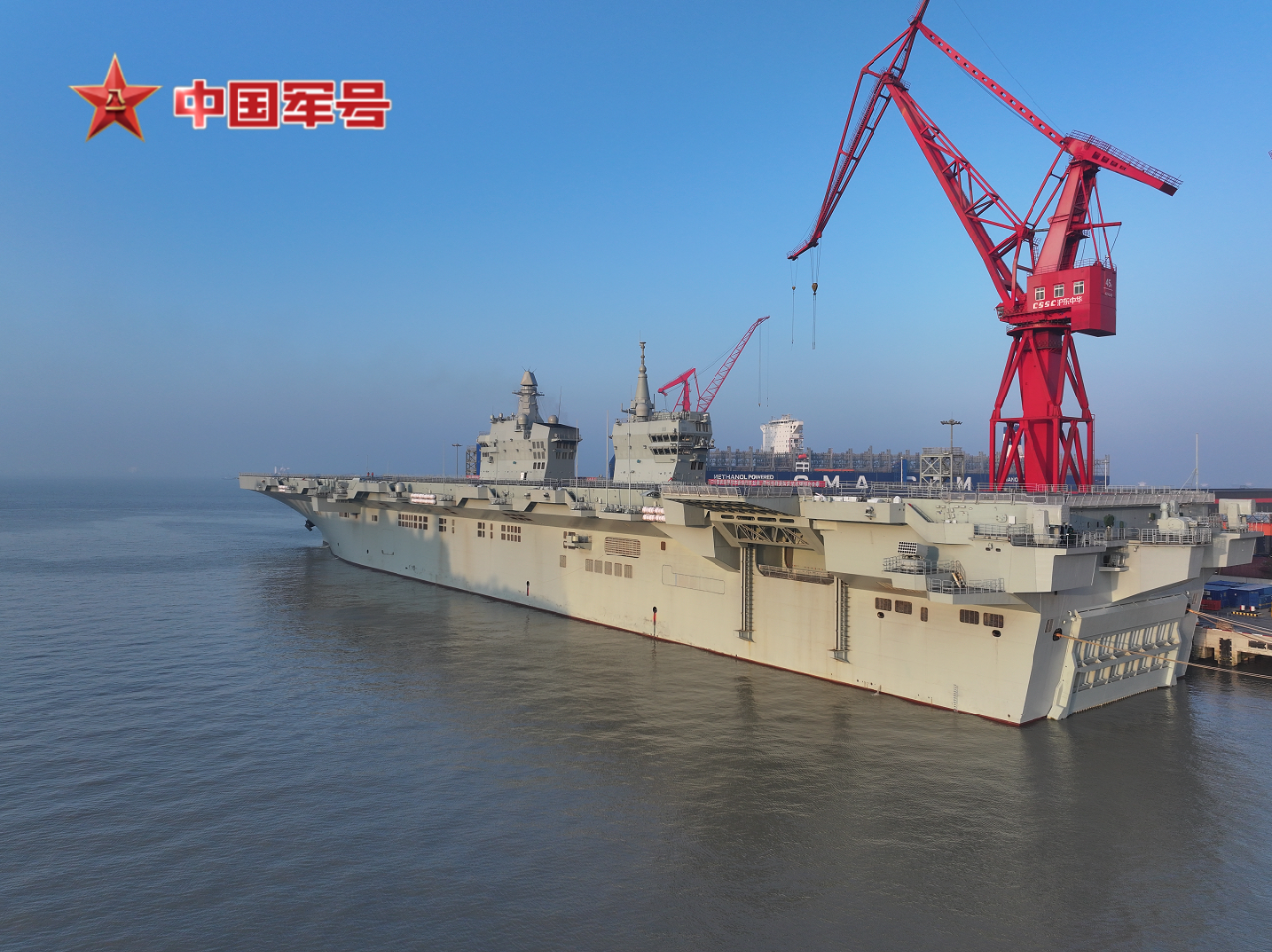 在五艘拖船的牽引下,四川艦離開滬東中華造船廠碼頭駛向相關海域。四川艦舷號為51,是海軍新一代兩棲攻擊艦,滿載排水量4萬余噸,設置雙艦島式上層建筑和全縱通飛行甲板,創新應用電磁彈射和阻攔技術,可搭載固定翼飛機、直升機、兩棲裝備等。