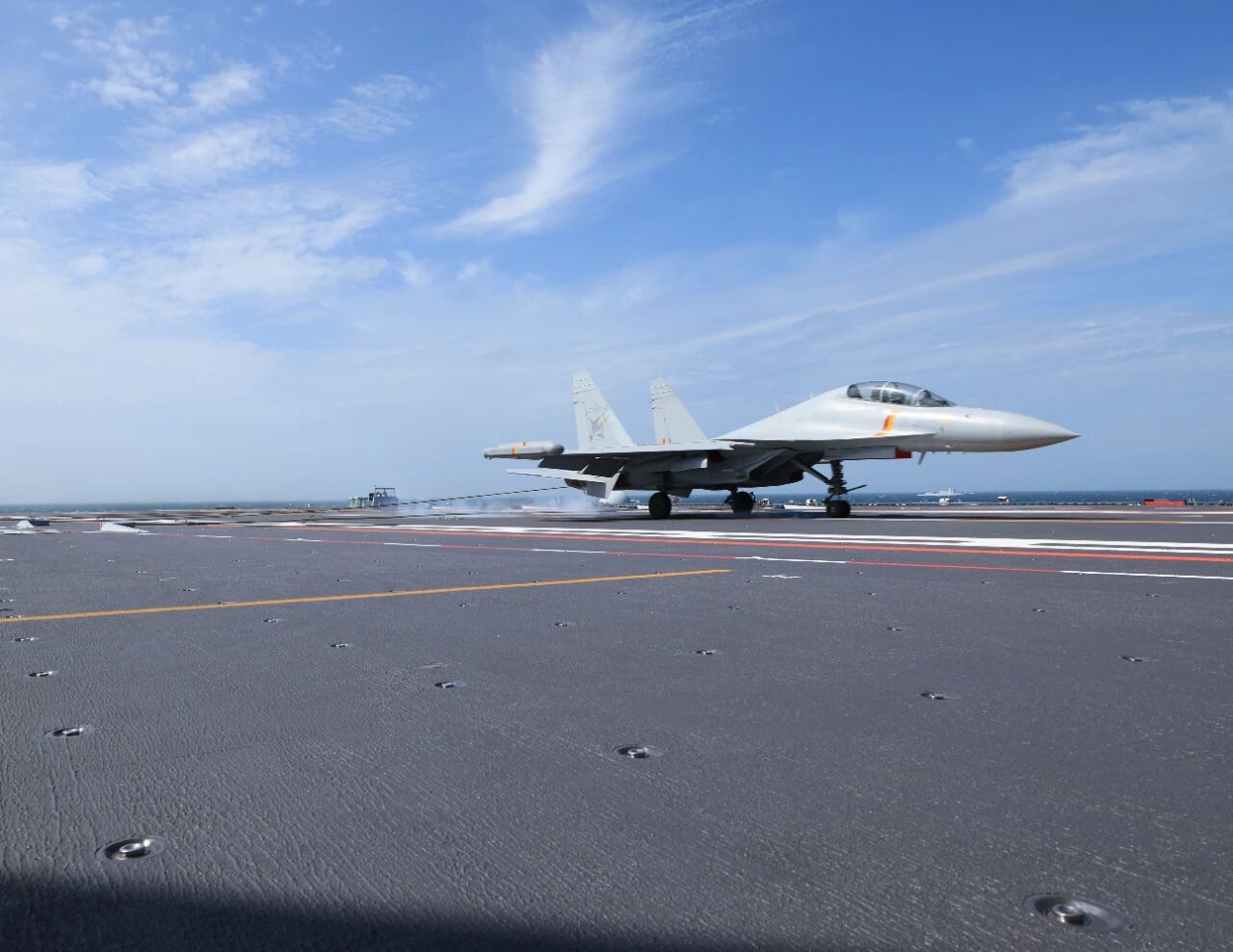 ▲殲-15DT飛機(jī)著艦瞬間 姜超 攝