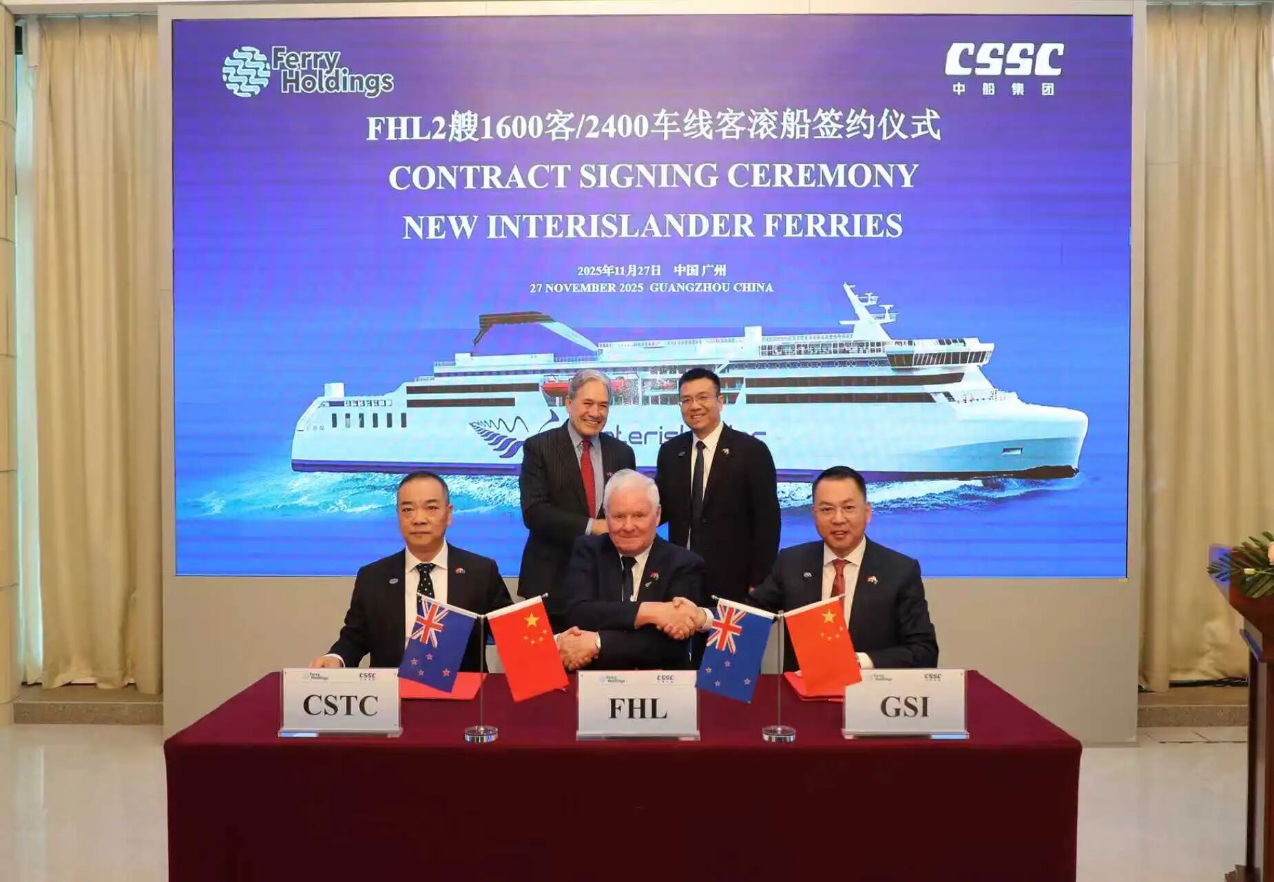 新西蘭外交部兼鐵道部部長Winston Peters(溫斯頓·彼得斯)、新西蘭FHL公司董事長Chris McKenzie(克里斯·麥肯齊)、中船集團(tuán)副總經(jīng)理彭原璞出席簽約儀式并致辭,新西蘭駐華大使Jonathan Austin(喬·文博)、駐廣州總領(lǐng)事Michael Zhang(張典)等出席簽約儀式。
