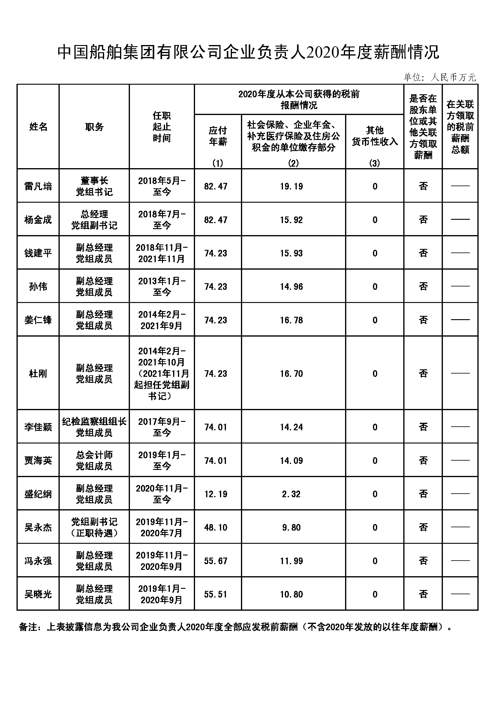 中國(guó)船舶集團(tuán)有限公司企業(yè)負(fù)責(zé)人2020年度薪酬情況